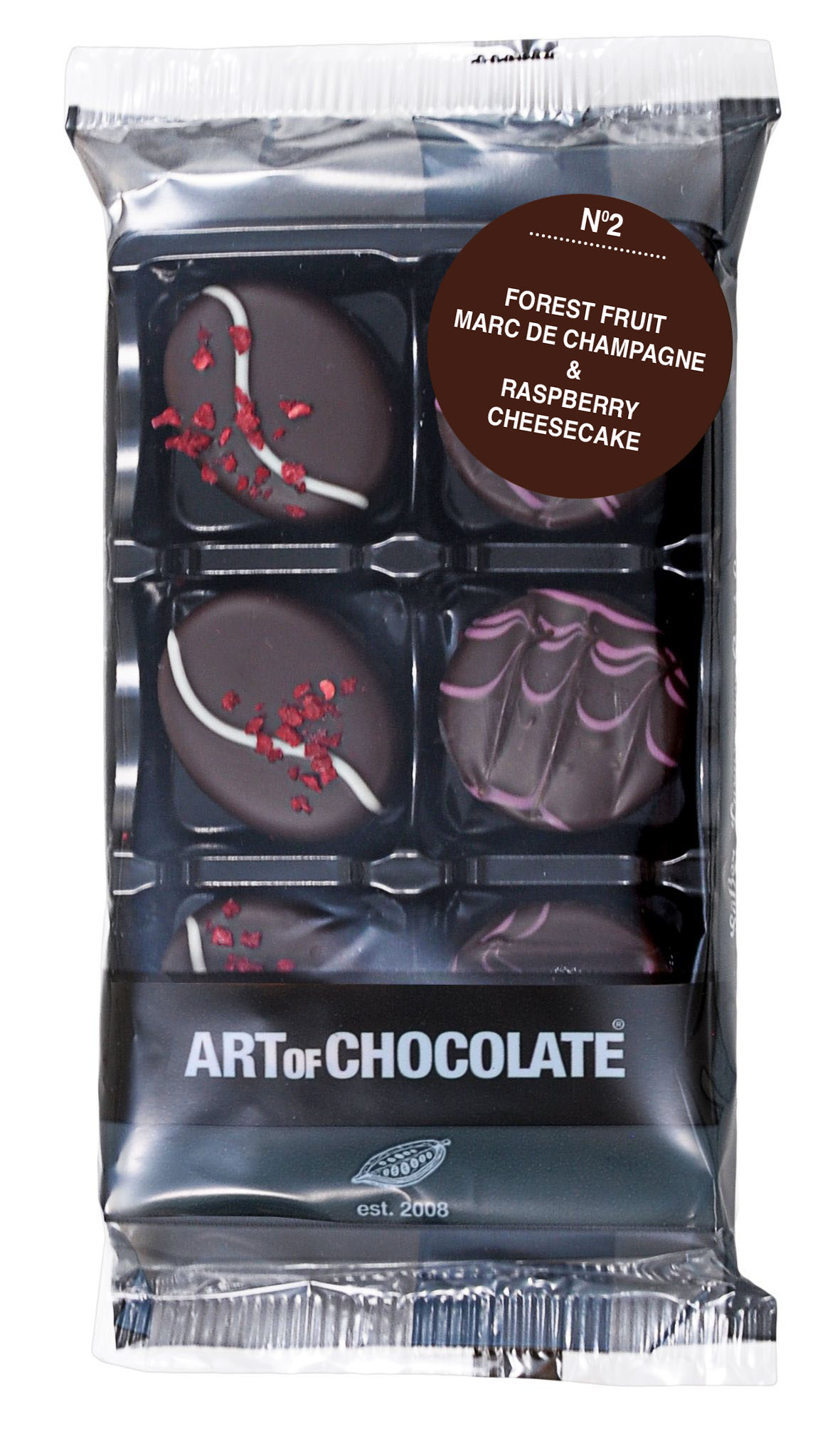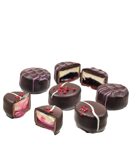 bestehend aus Pralinen: Waldfrucht Marc de Champagne & Himbeer Cheesecake